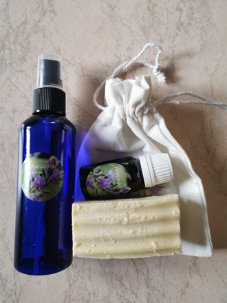 Geschenkset mit 1x Lavendelöl a 10 ml, 2x handgemachte Seife, 1x Duftkisschen und 1x Duftwasser a 100 ml.